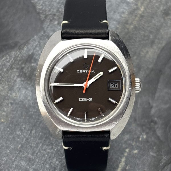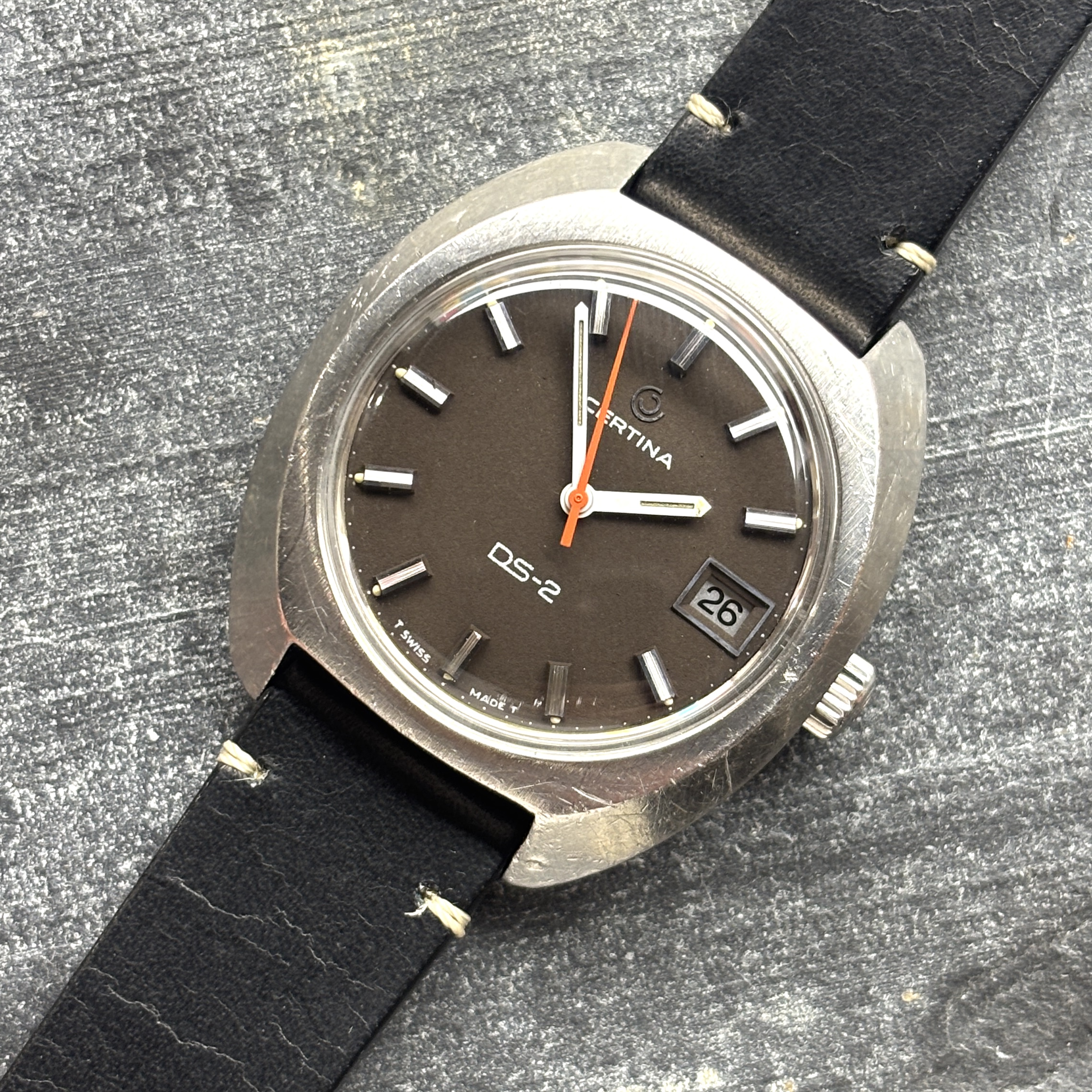 CERTINA, DS-2, ref 5301 300, boett i stål 38mm, manuell, cal 25-661, plexiglas, datum, läderband, 1970-tal.