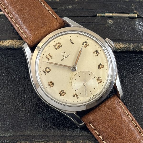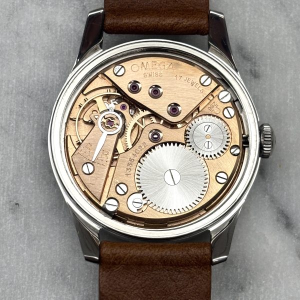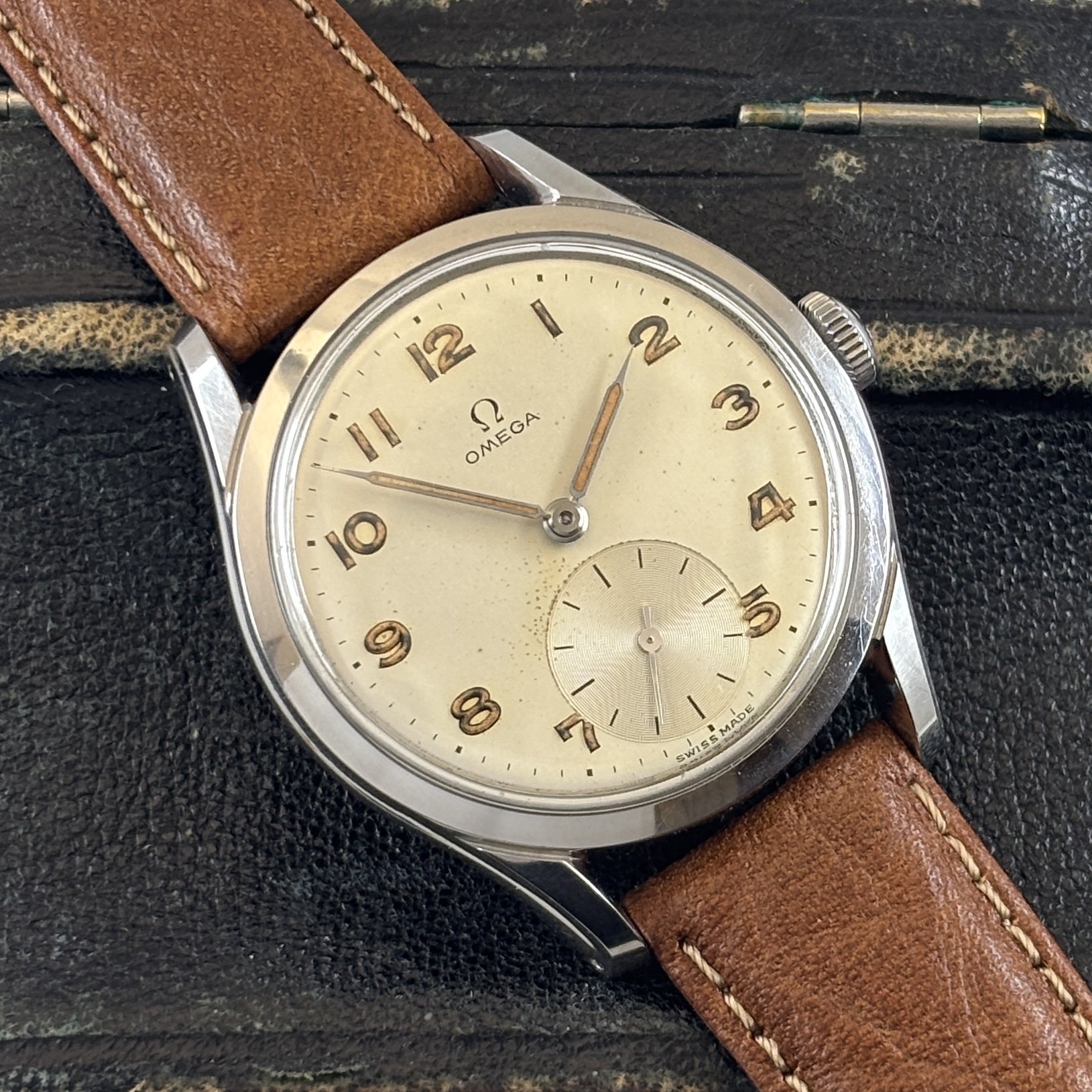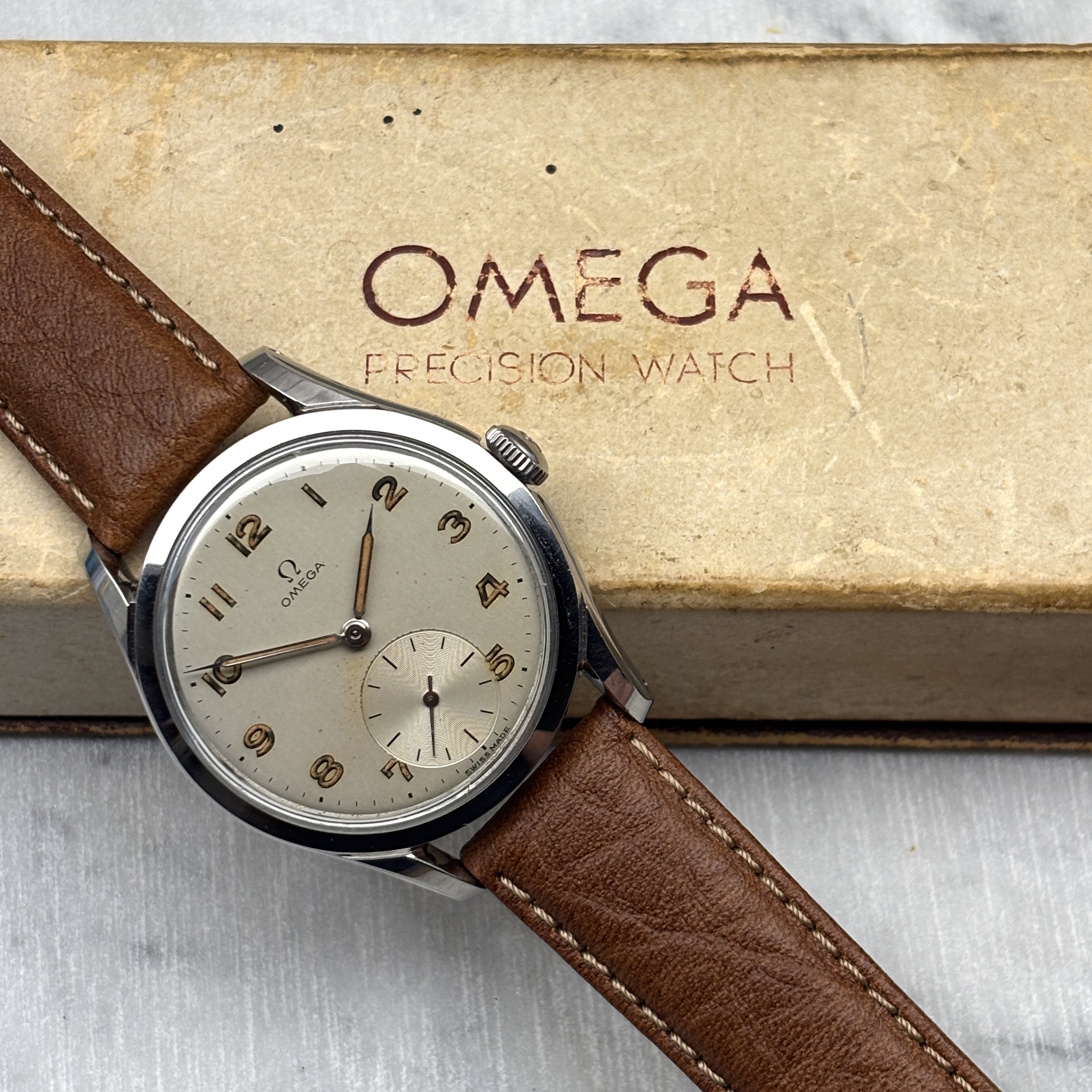 OMEGA, ref 2639-12, herrur, boett i stål 35mm, manuell, cal 266, sn: 13354622, plexiglas, liten sekundvisare, läderband, ask, bruksanvisning, ca 1951.